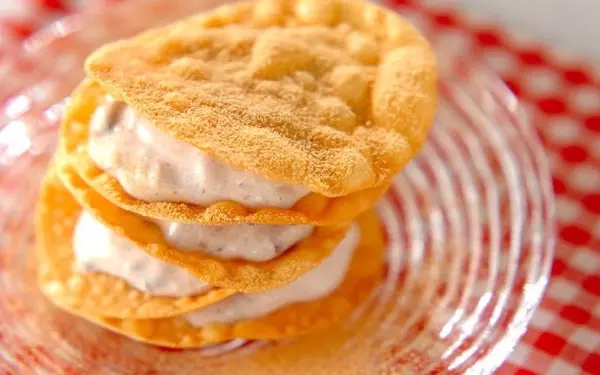餃子の皮をパリパリに焼いて、お手軽ミルフィーユに。クリームに小豆を加えることで、優しい甘さの和風デザートになります。ミルフィーユを最初から作るのは大変ですが、これなら気軽にできそうですね。