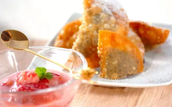 餃子の皮にチョコを包んで揚げ、手作りのイチゴソースをかけていただきます。トロッと溶けたたっぷりのチョコレートがたまりません! くれぐれもやけどには注意してくださいね。