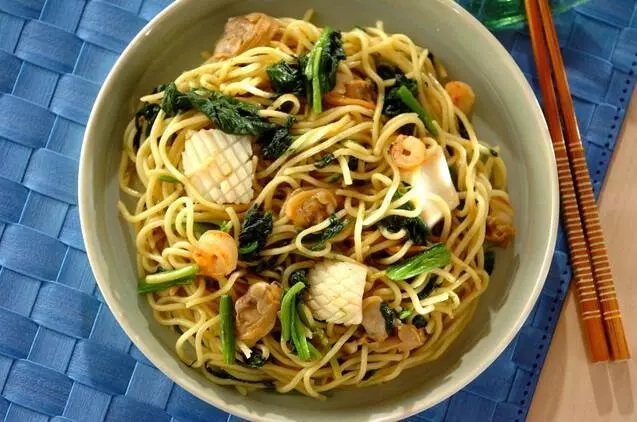 ホウレン草と焼きそばにシーフードの旨みがしみこんだ塩焼きそばです。10分で完成のスピードレシピ。テレワークのランチにいかがですか?