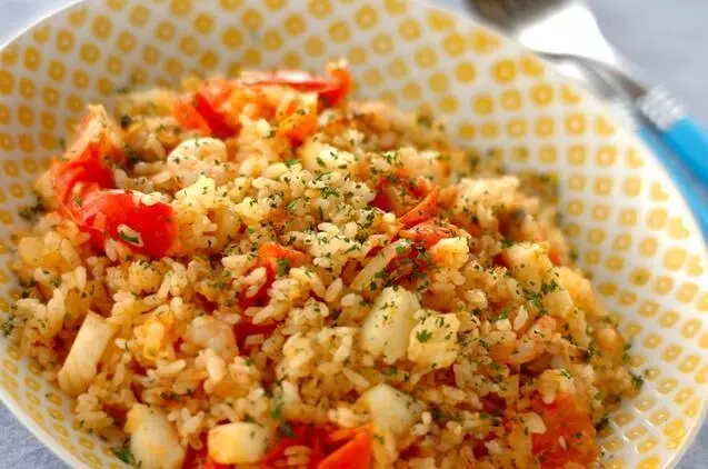 お米と具を炒めたらあとは炊飯器にお任せのピラフです。魚介の旨味がごはんに染み込みバターの香りが食欲をそそる一皿に仕上がります。レモンを添えてパセリを振って美しく盛り付けましょう。