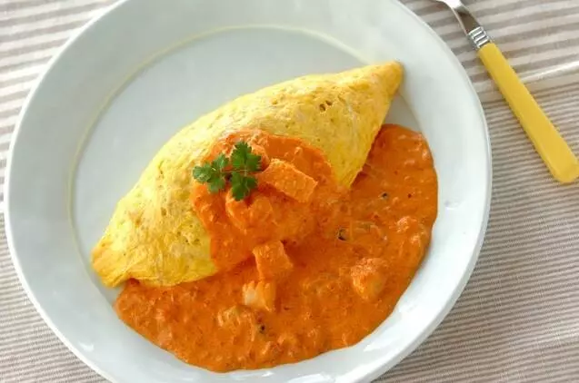 基本のトマトソースに生クリームを加えると、まろやかで上品な味わいになります。魚介との相性も良いので、シーフードミックス入りのソースにしましょう。普段とは少し違う味わいが楽しめるオムライスのアイデアレシピです。