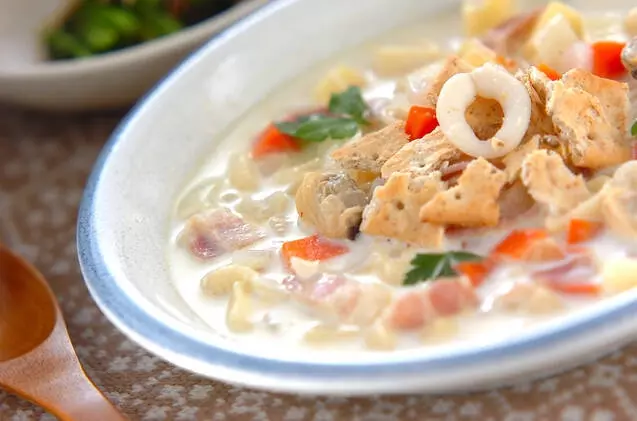 シーフードミックスで作る旨味たっぷりのクラムチャウダー。器に盛り付けたらクラッカーを割って加えましょう。おもてなしやランチにいかがですか?