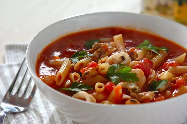 魚介の旨味がたっぷり入ったトマトスープパスタです。パスタは食べやすい早ゆでショートパスタを使います。みそで味付けをするのでコクと味に奥行きが出ます。