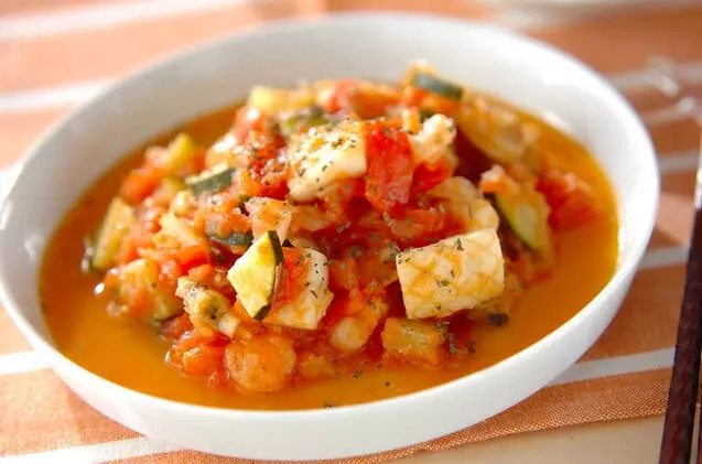 ズッキーニや玉ネギ、トマトがたっぷり入った洋風煮物。冷凍のシーフードミックスを使えば下処理も無く、とっても簡単に作れます。魚介と野菜の旨味がたっぷり入った食べ応えのある一品です。