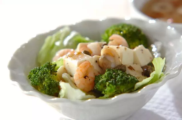 豆腐とシーフードミックスを合わせたサラダ仕立て、138calのヘルシーレシピ。ケイパーとしょうゆで作るちょっぴり和風のドレッシングはサラダと相性抜群です。