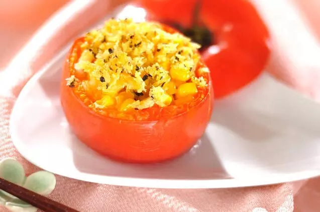下処理したシーフードミックスとコーンをマヨネーズで和えてトマトカップに詰めて焼き上げたおもてなしにぴったりの一品です。オーブンに入れて表面に焼き色がついたら器に盛り、ヘタの部分を添えましょう。