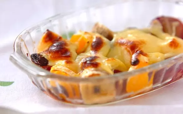 ぶどうやミカン等のフルーツにカスタードクリームをのせて焼いた、スイーツグラタンです。カスタードクリームは鍋で作るとちょっと難しいですが、レンジを使えば手軽に作れます。熱々のままでも、お好みで冷やしても美味しいですよ。