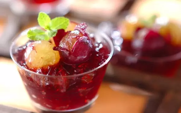ぶどうにトロトロの梅酒ジュレを合わせた大人なデザート。甘いものが苦手な方でも食べやすいです。ジュレをかためすぎないことがポイント。アルコールが入っていますので、食べ過ぎにはご注意くださいね。