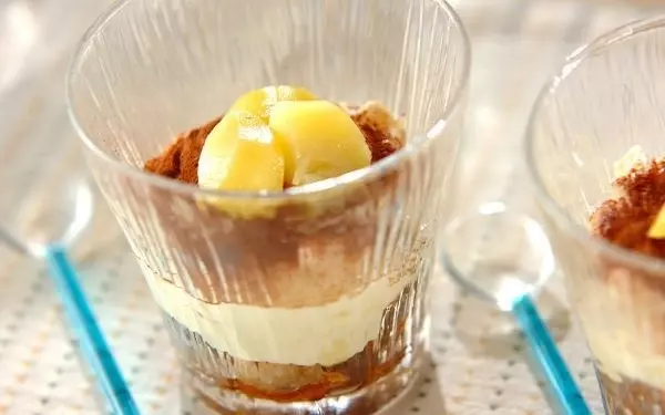 栗の甘露煮とマスカルポーネを組み合わせる、ユニークなティラミスです。材料をミキサーにかければ良いので、15分あれば出来上がり。急な来客でも慌てず作ることができますね。甘い栗にコーヒーとココアの苦みがベストマッチ。