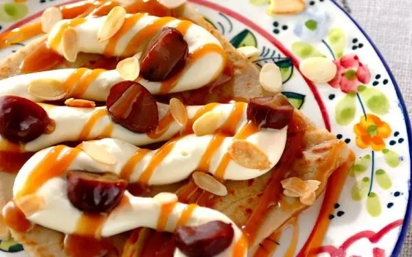 そば粉で作るガレットに、マスカルポーネで作ったふわふわクリームをたっぷりのせていただきます。マスカルポーネとメレンゲを混ぜ合わせることで、軽い口当たりに。メレンゲが潰れないように、サッと混ぜるのがポイントです。スライスアーモンドや栗の渋皮煮で食感をプラスしましょう。