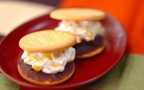刻んだ栗の甘露煮とマスカルポーネを混ぜ合わせ、こしあんを塗ったビスケットでサンド。一口食べるごとにさまざまな食感に出会えますよ。マスカルポーネが少しだけ余ったときの活用にもGOOD。ビスケットはできるだけシンプルなものを選んでくださいね。