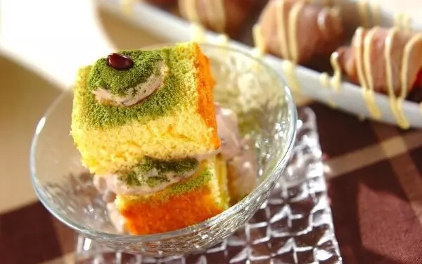 マスカルポーネと茹で小豆をふんわり混ぜたら、市販のカステラと一緒に盛りつけましょう。盛りつけ方次第で見た目の印象が変わるので、何通りもの楽しみ方ができますよ。抹茶の香り上品で、日本茶との相性抜群です。