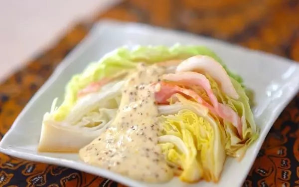 やわらかな春キャベツにベーコンをはさんで蒸し焼きにすると、簡単ながら奥深い一品に仕上がります。キャベツにかけるドレッシングにマスカルポーネを使いましょう。マヨネーズや粒マスタードなど手に入りやすい材料で作れるのがポイント。あっさりとしたキャベツの美味しさを格上げしてくれますよ。