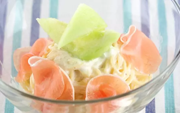 マスカルポーネをパスタソースに使います。ハチミツや塩、コショウなどで味を調えるだけなので意外と簡単。果汁たっぷりのアンデスメロンとも好相性ですよ。生ハムの塩味が効いていて後を引く美味しさ。スパゲティーは細いタイプを選ぶとよりソースとなじみやすいです。
