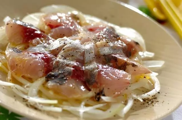 旬のアジをシンプルなカルパッチョに。素材そのものの味わいが楽しめます。今回は刺身用を使用していますが、1匹まるごと買う方が安い場合はぜひ、アジの3枚おろしに挑戦してみて下さい。格別の味ですよ。
