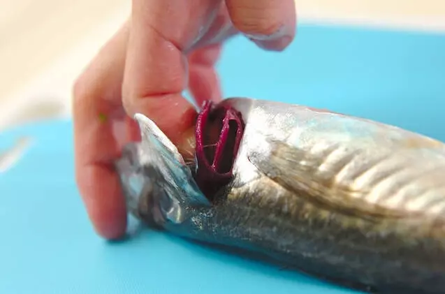 ②盛りつけた時に裏になる側(頭を右、腹を自分側)からエラぶたを上げてエラを取り、尾の付け根部分にあるかたいウロコ状のゼイゴを尾側から頭に向かって取る