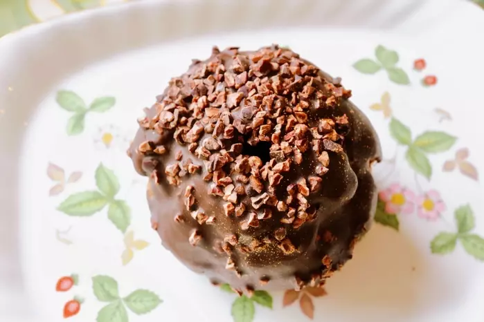 チョコレートが入ったシューに、外側にもチョコレートがしっかりコーティングされています。ナッツと金粉のようなキラキラとしたものが散りばめられていて、シックな色合いながら上品さを感じます。手で持つとクリームがたっぷり入っていそうなわくわく感が…!
