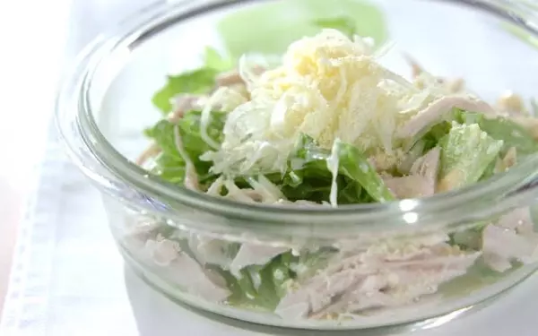 蒸したささみとレタスを合わせたサラダ。ささみは電子レンジで蒸すので手間いらず。ドレッシングに鶏の蒸し汁も混ぜ合わせることで、旨味とコクがアップします。仕上げの粉チーズはたっぷりかけてくださいね。