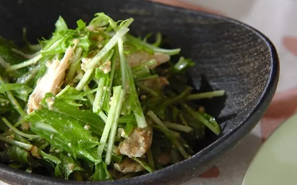ささみと水菜を、すりゴマとカッテージチーズたっぷりのコクのあるドレッシングで和えて完成です。水菜のシャキシャキした食感を生かすために、ドレッシングは食べる直前に和えるのがポイント。水菜をたくさん食べられるので、野菜不足だと思ったら、ぜひお試しを。