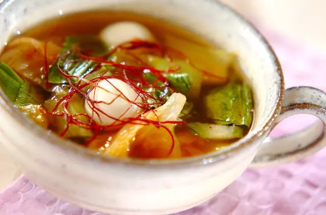 キムチとチンゲンサイで作るピリ辛中華スープ。ウズラの卵入りで食べ応えUPします。仕上げに糸とうがらしを乗せて完成です。
