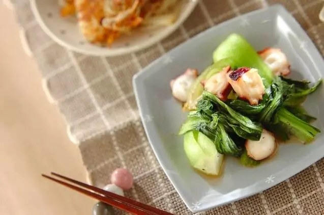 チンゲンサイは、根元と葉を時間差で炒めてシャキシャキ感を残しましょう。ヘルシーなタコと合わせた炒め物は1人前67kcalと低カロリー。ダイエット中でも安心です。