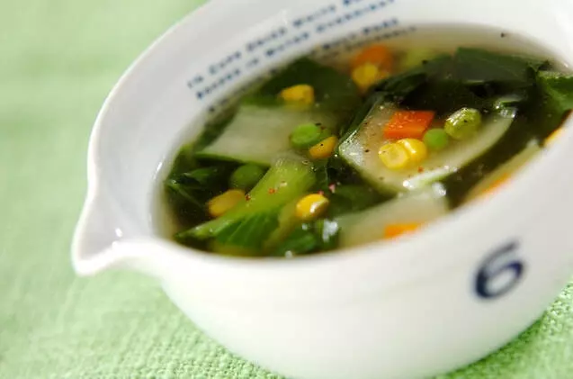 チンゲンサイとミックスベジタブルで作るカラフルなスープはトロミがあって、とっても食べやすいですよ。