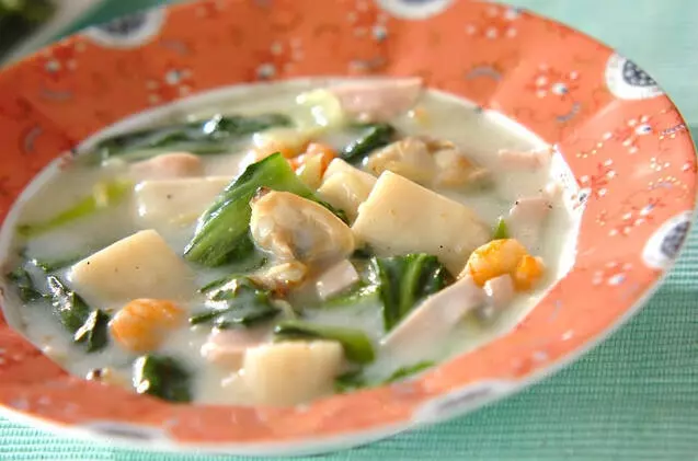 ホタテ缶の汁ごと使った旨味たっぷりのクリームには豆乳を使っているのでヘルシーです。チンゲンサイの茎を入れるのがポイント。シャキシャキとした食感が醍醐味です。