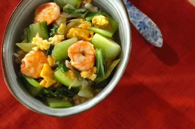 10分で完成のスピードレシピ。エビとチンゲンサイ、卵の彩りが美しい一品です。忙しい日やテレワークのランチにオススメですよ。