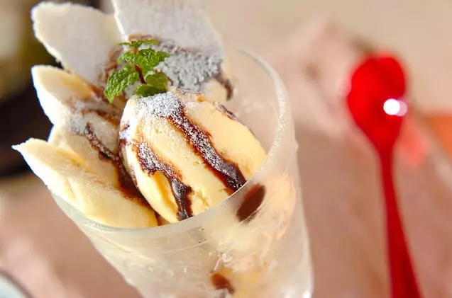 市販の「もなか」を使ってバナナとアイスクリームをサンドしただけ。ねっとり甘いバナナアイスに、カリッとビターなチョコレートがアクセントに。「もなか」がない場合は、市販のクッキーにサンドしても美味しいですよね。サンドしたらオシャレなカフェ風にも。