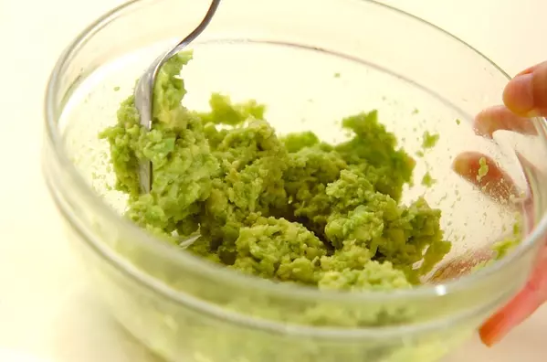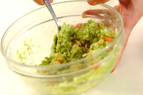 1、ボウルにアボカドを入れてフォークなどでつぶし、レモン汁をからめる。