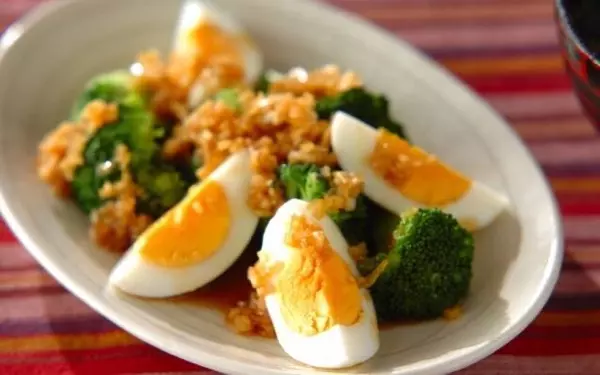 ブロッコリーとゆで卵はマヨネーズで和えるのが定番ですが、こちらはさっぱりした玉ネギソースでいただきます。シャキシャキした玉ネギの食感が、淡泊な味わいのブロッコリーとゆで卵にベストマッチ。香ばしいゴマ油の香りも食欲をそそりますよ。