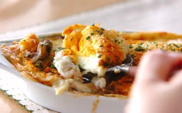 ゆで卵や玉ネギに、ホワイトソースをかけて焼き上げます。お肉の代わりにゆで卵を使い、牛乳ではなく豆乳でホワイトソースを作るため、ヘルシーな一品です。とはいえ、チーズのコクが加わって、そこそこの食べ応えがあるのがポイント。