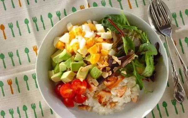 焼いたサーモンをご飯に混ぜ合わせ、ゆで卵やアボカドをトッピングしてサラダ風に仕上げます。彩り豊かで、栄養バランスも良く、カフェのサラダのようですね。ドレッシングはお好みのものを使って、アレンジしてください。