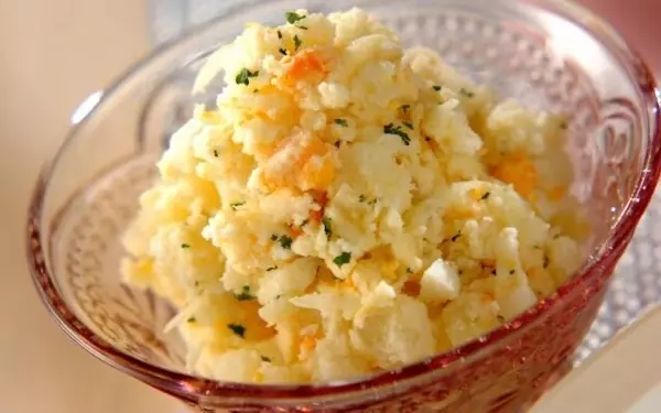 ゆで卵と玉ねぎ入りのポテトサラダ。ゆで卵とマヨネーズのまろやかな風味に、玉ねぎのシャキシャキした食感がアクセントになります。シンプルな味つけなので、お好みの具材を追加しても良いですね。サンドイッチにはさんでも美味しいですよ。