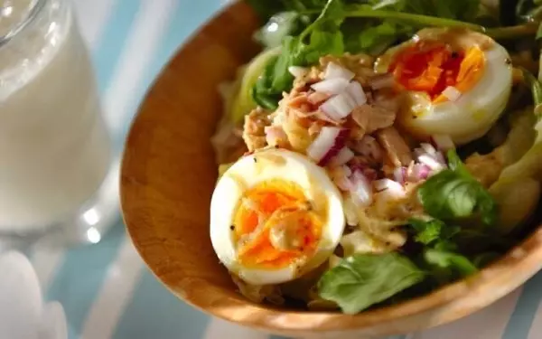ツナとゆで卵が入ったボリューム満点のサラダです。野菜とタンパク質を同時に摂れるため、栄養バランスも抜群。マスタードドレッシングの上品な風味が、いつものサラダをワンランクアップさせます。このドレッシングは、魚や肉を使ったサラダとも好相性です。