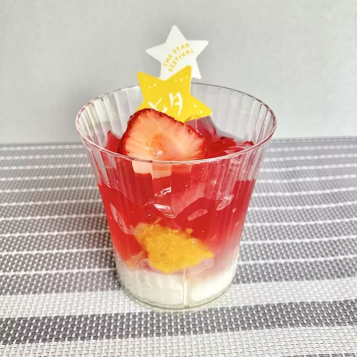 食感のアクセントにはオレンジ、歯ごたえのあるナタデココシロップ漬けも入っていて、お値段の割に豪華!キラキラ輝くゼリーが七夕にぴったりなカップゼリーです。