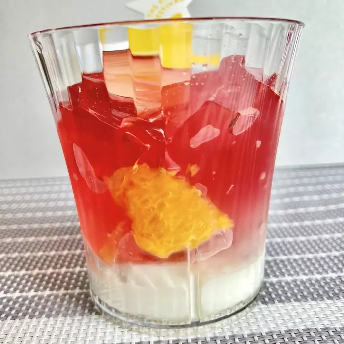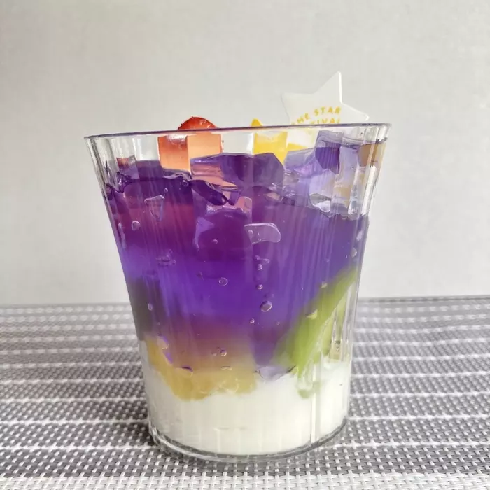 最近話題の酸性のものを入れると色が変わるバタフライピー(※)の鮮やかな青紫色がとっても涼し気。こちらも2種類の食感のバタフライピーゼリーが入っています。