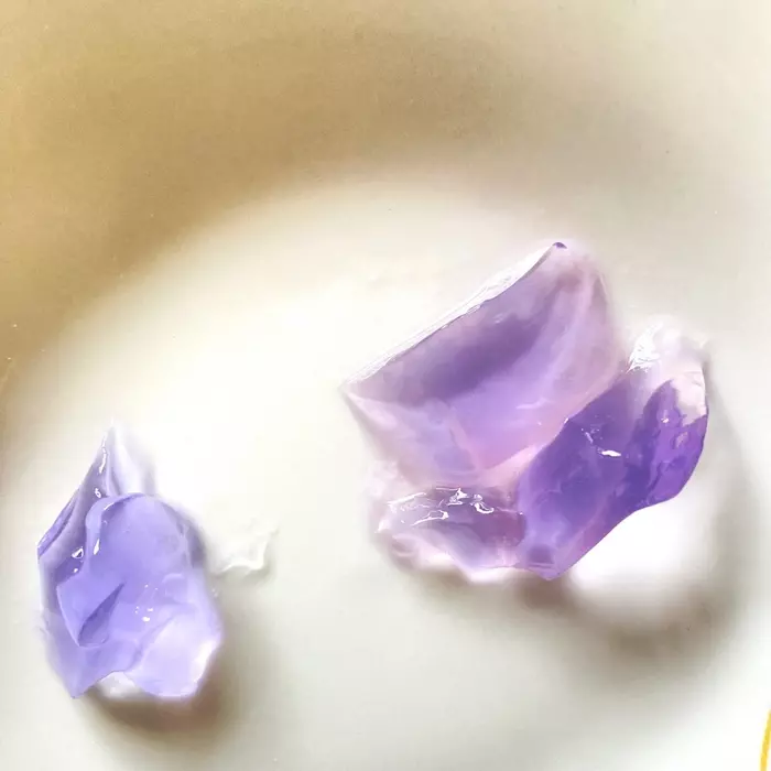 ※バタフライピーはレモンなどの酸性のものを混ぜると青色から紫色に変化します。夏休みの宿題で実験に使ったことのある人もいるのではないでしょうか。なんでも試してみたい筆者はバタフライピーのゼリーの部分を少し取り出してレモン水を付けてみました!うっすらゼリーのふちが紫色に変化しました♪