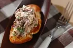 しば漬けとツナをマヨネーズであえてバケットに乗せた和風ブルスケッタです。意外な組み合わせですがパンによく合います。是非一度試して欲しい変わり種ブルスケッタです。