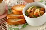 1、バゲットにオリーブ油を薄くぬり、トースターでこんがりと焼く。焼き上がったらニンニクをこすりつける。