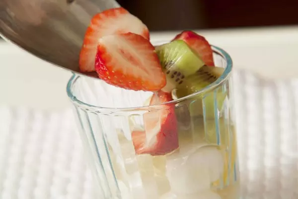 豆腐入りのヘルシーでモチモチした食感の白玉にイチゴやキウイを加えて、炭酸水で割ったヘルシーで色鮮やかなフルーツポンチです。ガラスの器に盛り付けると涼やかに演出できます。