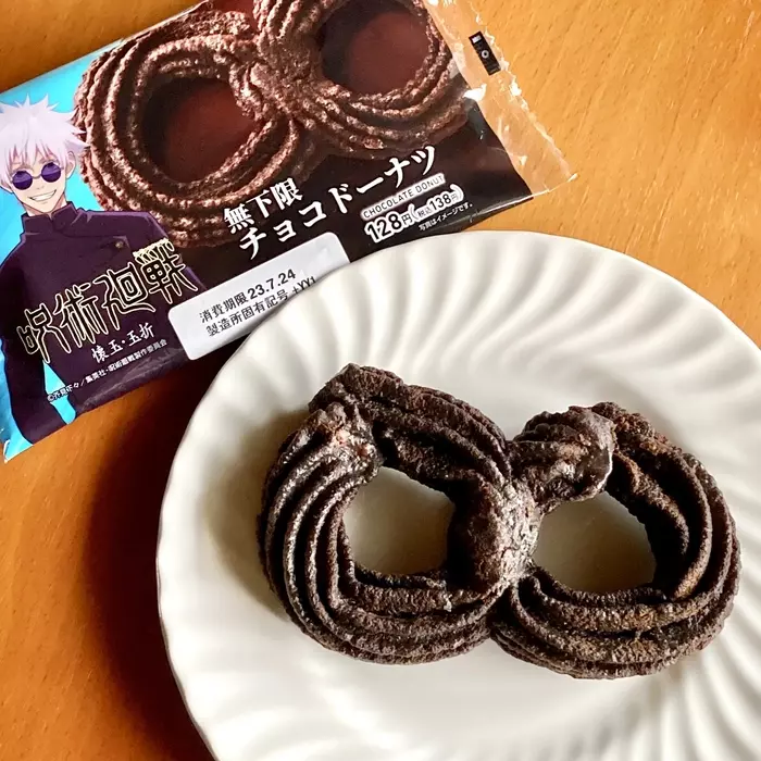 五条悟の術式「無下限呪術」を表現した∞の形に生地を絞り出したチョコドーナツ。米粉とブラックココアパウダーを配合した生地はギュッと引き締まっていて、包丁で切ろうとしたらぎっしりとした手ごたえがありました。