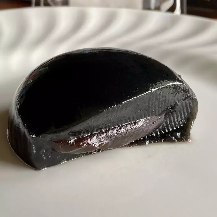 夏油傑(げとうすぐる)の術式「呪霊躁術」に必要な呪霊を取り込むための真っ黒い「呪霊玉」をイメージした水まんじゅうです。作中ではこの呪霊玉、全くおいしくない代物のようでしたが、こちらの水まんじゅうはとっても美味しい!