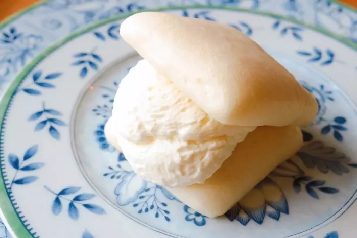 北海道産の生クリームを使用したホイップを、白いパオ生地で挟んだスイーツサンドです。パオは、中華まんなどに使われる生地のことです。パン生地と違って、とっても軽い食感です。