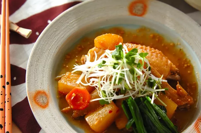 しっかり煮込んだやわらかい大根と鶏手羽先はピリ辛みそ味で、コクがあっておいしい。