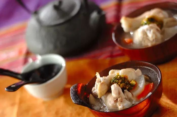 韓国では栄養豊富なお粥を朝食などによく食べます。野菜たっぷりの鶏粥に、ネギの辛み和えを添えて。体温まる一品は夏バテにもオススメです。