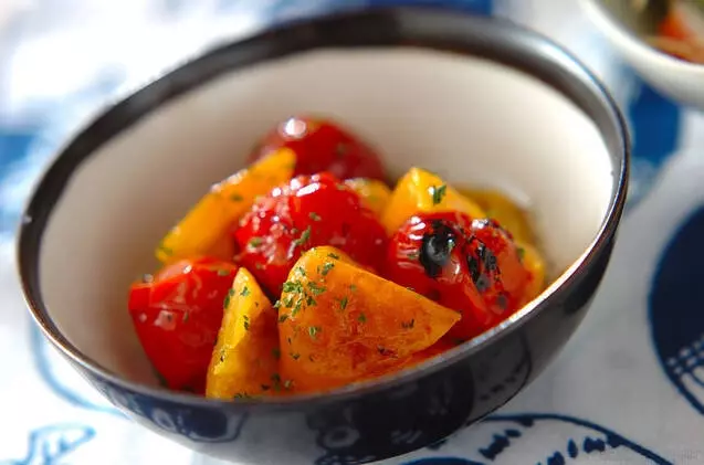黄色のパプリカとミニトマトの色鮮やかななマリネです。黄色いパプリカは強火で表面が真っ黒になるまで、ミニトマトは皮がはじめるまで焼きましょう。