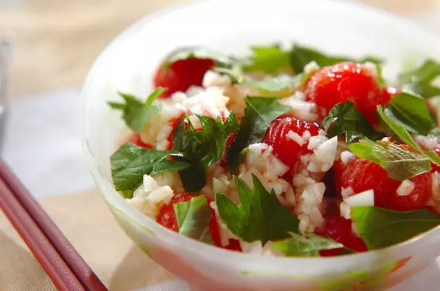 たっぷりの大葉の香りが良く、ミニトマトをたくさん食べられるマリネです。みじん切りにした玉ねぎや、ごま油がベストマッチ。脱マンネリにもおすすめ。
