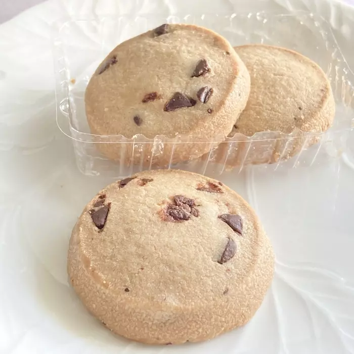 クッキーは3個入り。口でほろほろと崩れる記事に、ゴロゴロと入ったチョコチップの歯ごたえが美味しいクッキーです。