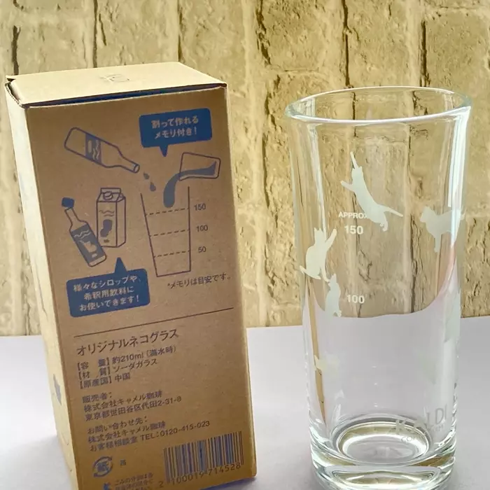 満水時の容量は約210ml。さらにネコのイラストが入ったグラスには、なんと便利なメモリ付きです。メモリは下から50ml, 100ml, 150mlと3つの位置に印があります。